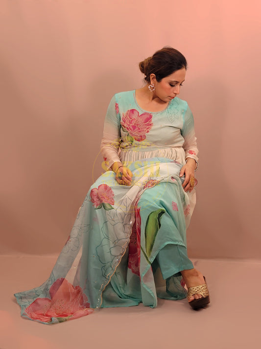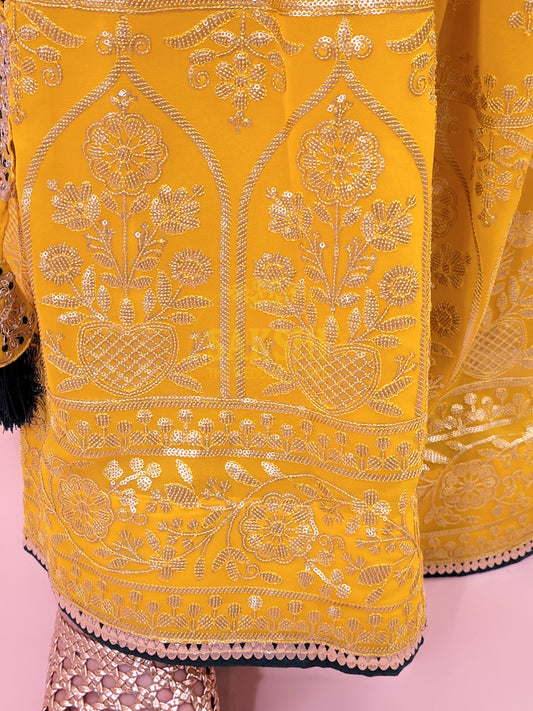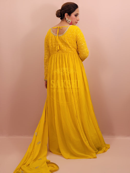 Elegant Yellow Chinnon Anarkali Suit with Chikan work Choli
