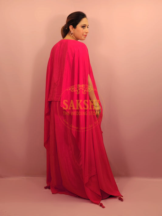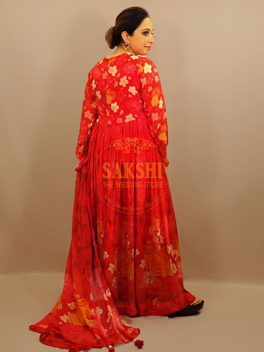 Red Georgette Gown with Saree Drape and Designer Shrug