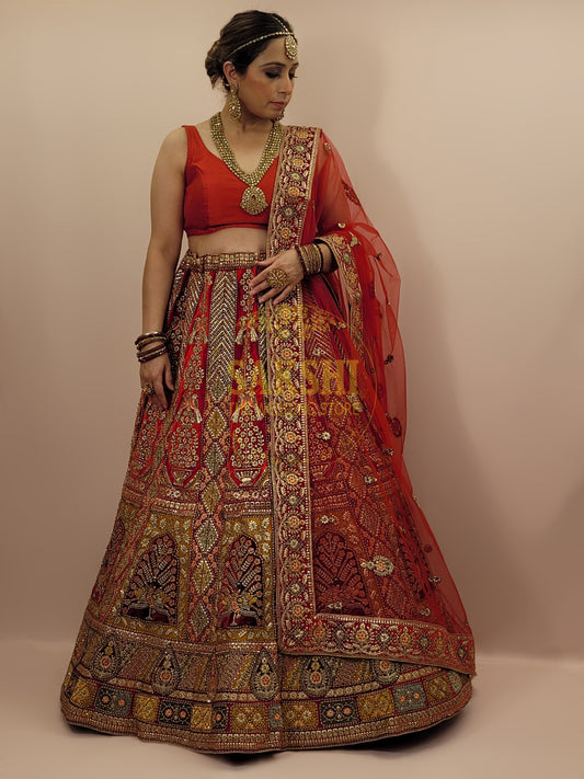 Bridal Red Lehenga adorned with intricate multicolor embroidery