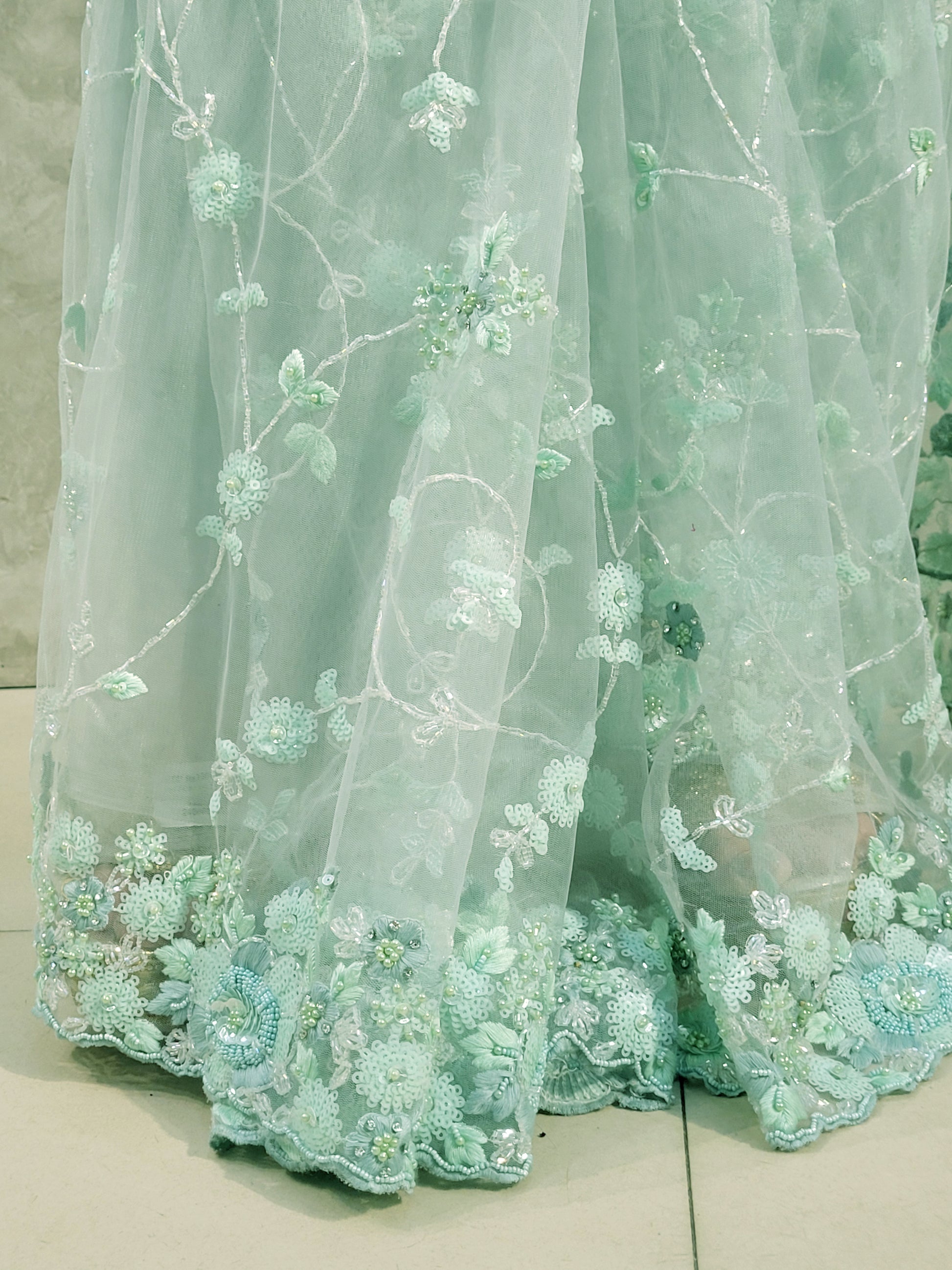Alia Bhatt Met Gala look inspired Sea Green Handwork Net Saree. Resham, Sequins and Beads work. Heavy unstitched blouse piece included.