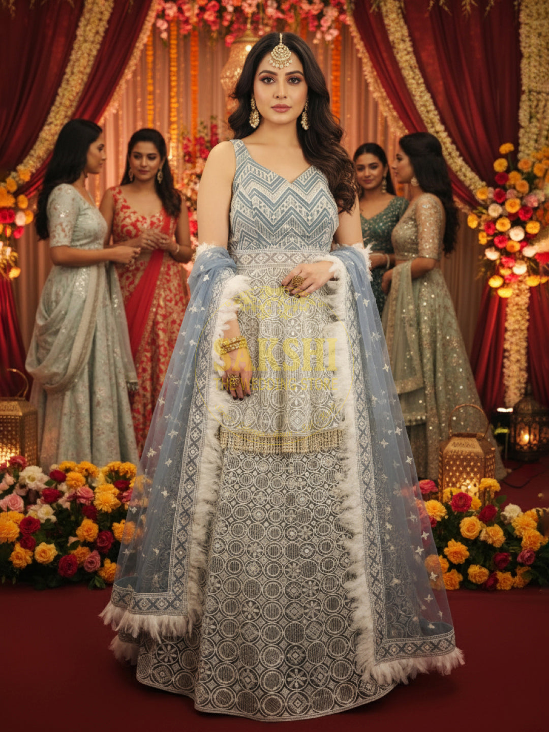 A luxurious peplum top with intricate chikan embroidery, coupled with a heavy embroidered lehenga and a net dupatta graced with fur, makes for an opulent choice for party and engagement attire.