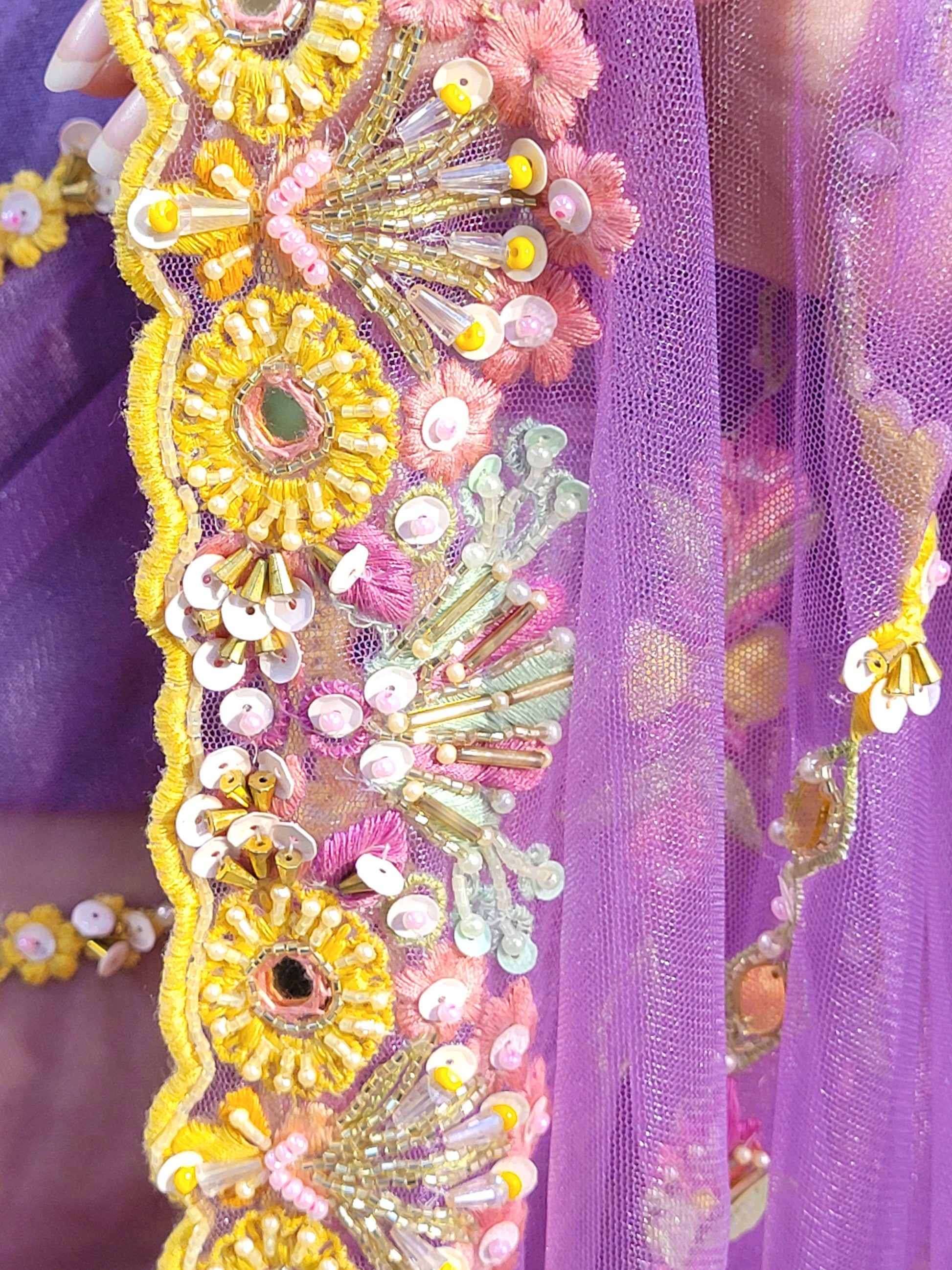 Lavender Purple Net Saree. Papa Dont Preach Inspired Embroidery using imported sequins, beads and resham. Heavy embroidered blouse piece included.