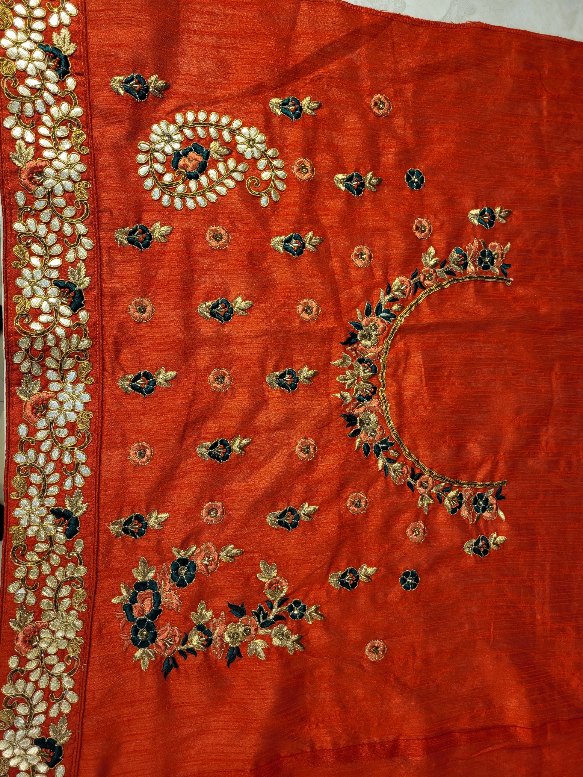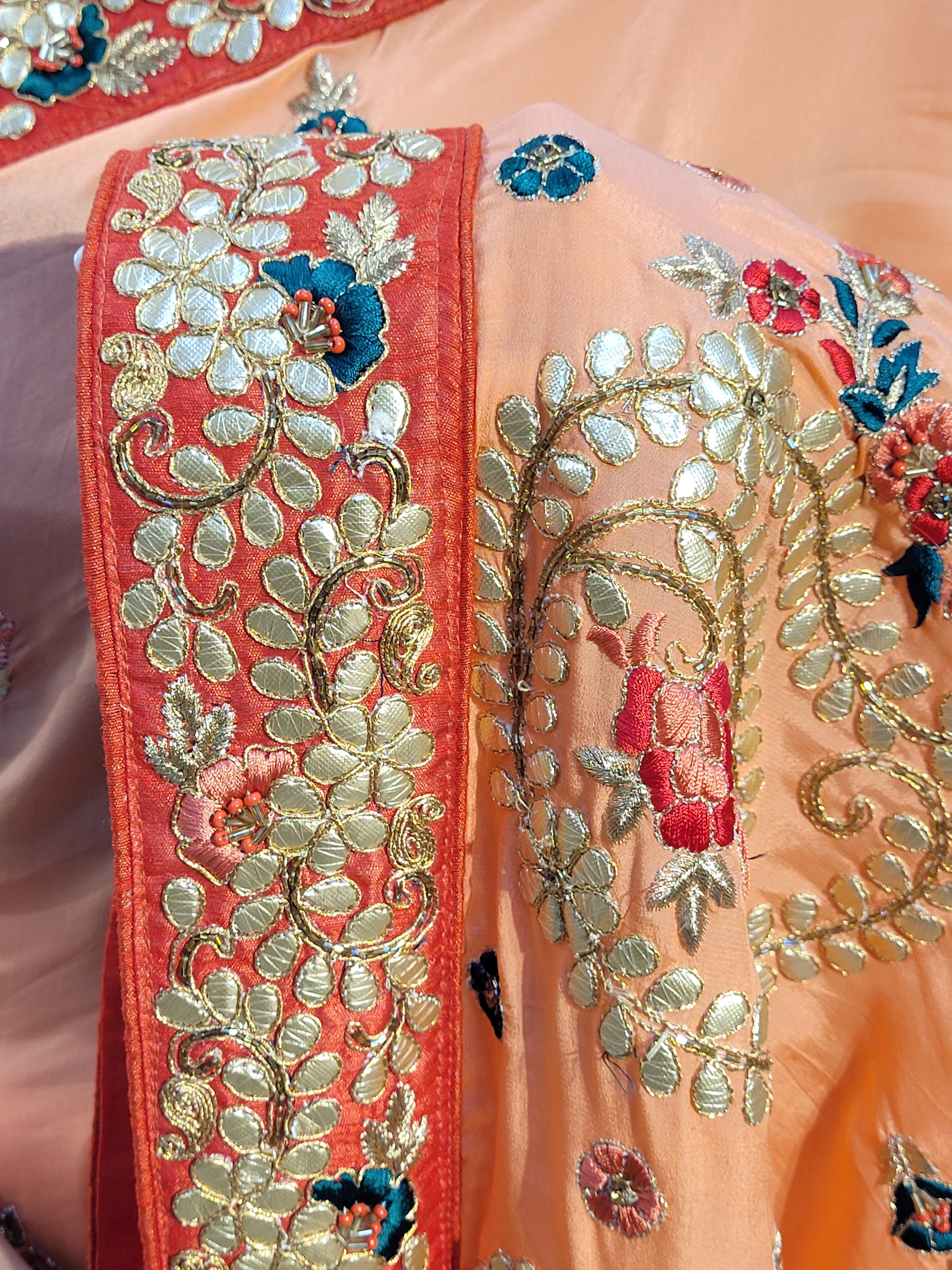Peach Shaded Crepe Saree with Gota Patti Work. Heavy Embroidered Border and Blouse Piece.