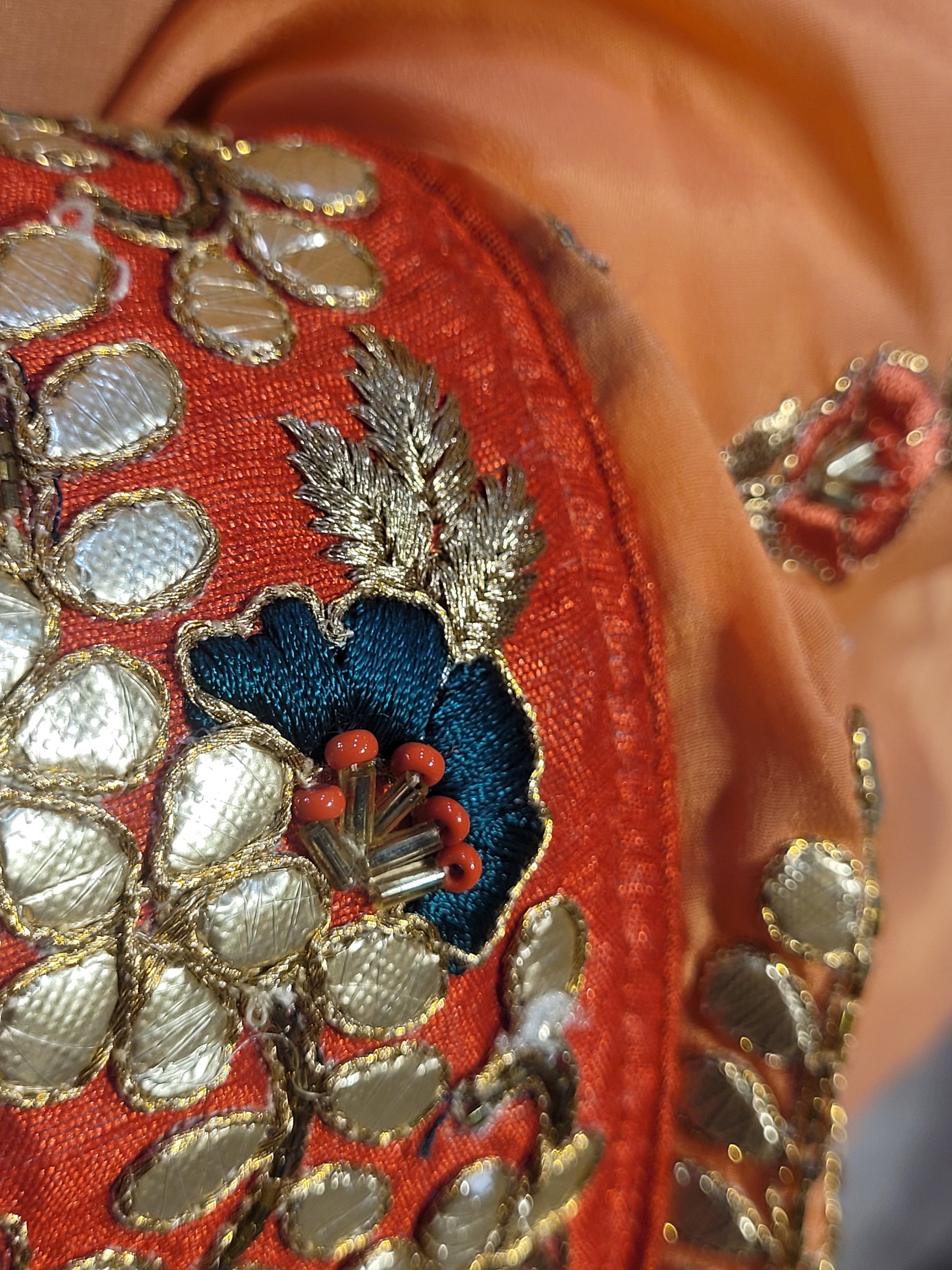 While our crafts persons and tailors create every attire with the utmost diligence, the ones with beads and sequins are always the most daunting. Beads and sequins tend to fall off the fabric, even with the best of handling. Losing a few beads or sequins does not affect the overall look of the attire and cannot be noticed even under scrutiny.