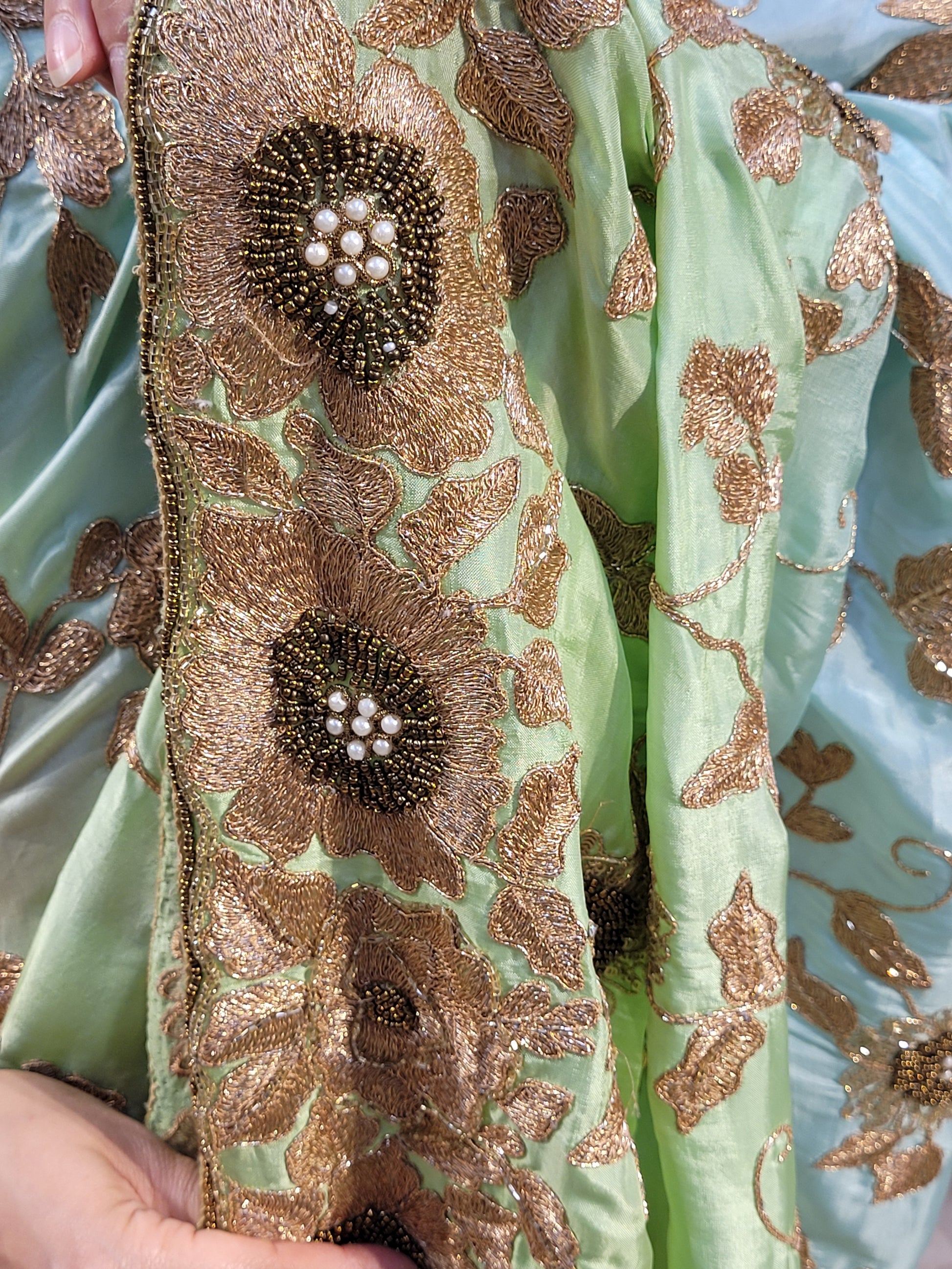 Pista Green Ombre Crepe Silk Handwork Saree. Zari and Beads Work. Heavy unstitched blouse piece included.