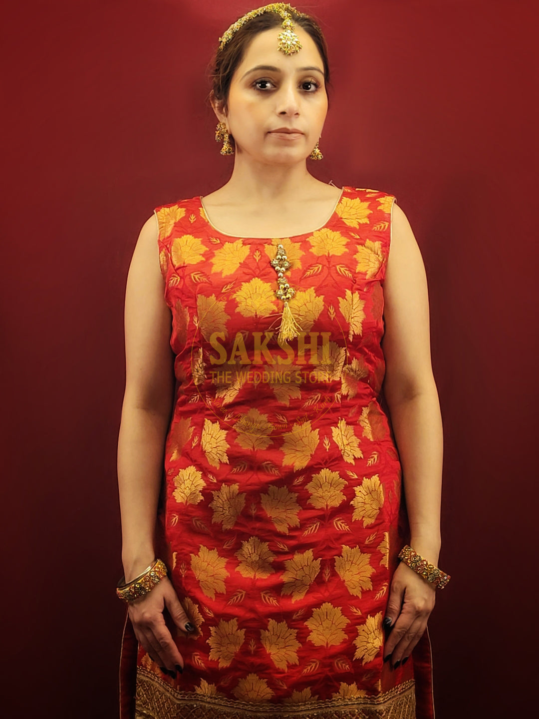 Elevate your style with this red gharara kameez set. This luxurious ensemble features a vibrant red color and ombre contrast on the gharara, woven kameez, and gota patti work dupatta. The banarasi kameez adds a touch of elegance, while the georgette gharara and net dupatta make it perfect for parties or weddings. Experience the best of traditional craftsmanship and contemporary design in this sophisticated piece.