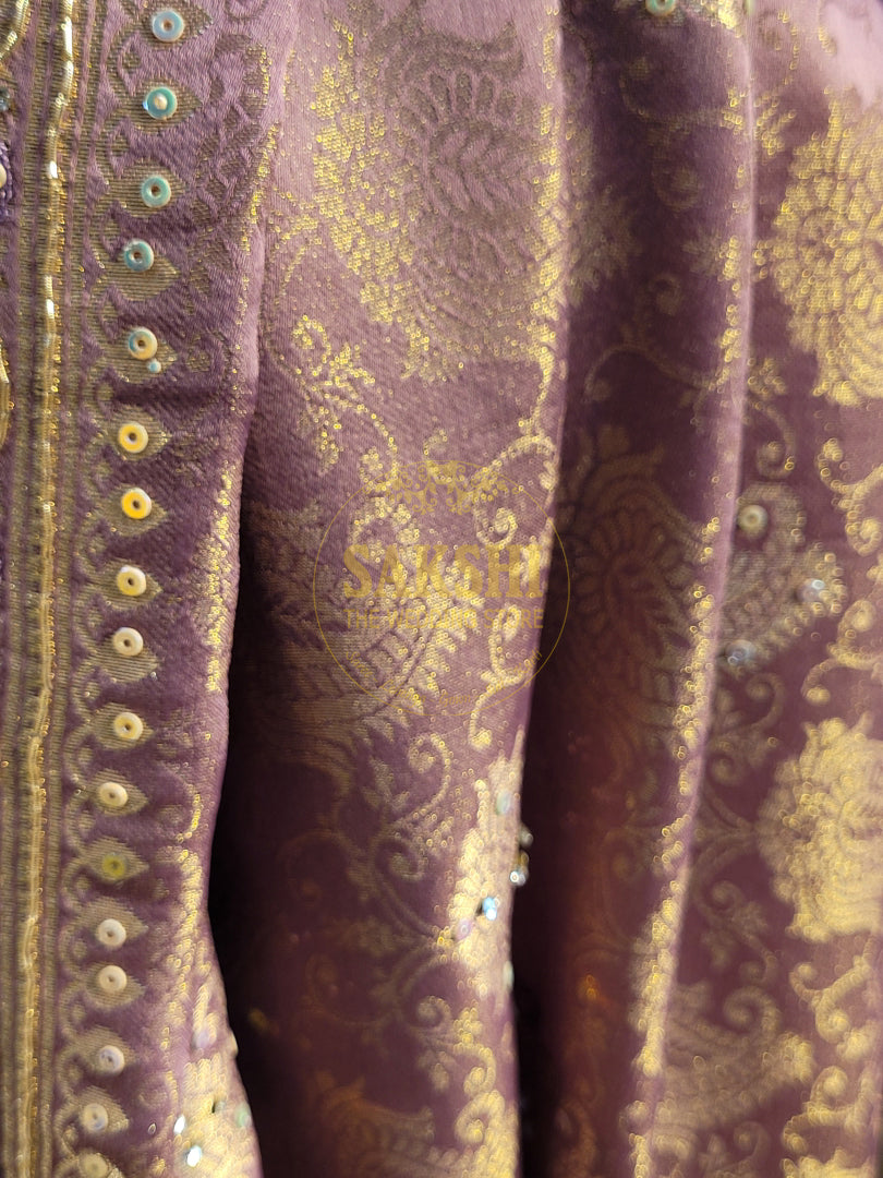 Shimmer Tissue Lavender Handwork Saree. Weaves highlighte with handworkusing Dabka, Sequins, Mirror and Resham. Unstitched Blouse Piece included.