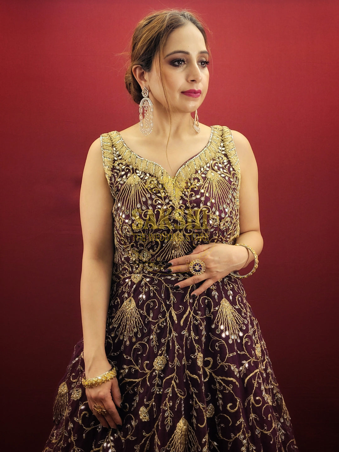 Embrace the elegance of a wine-colored gown, lavishly embellished with zari, dori and mirror work, ideal for makin a statement at engagement events and wedding parties.